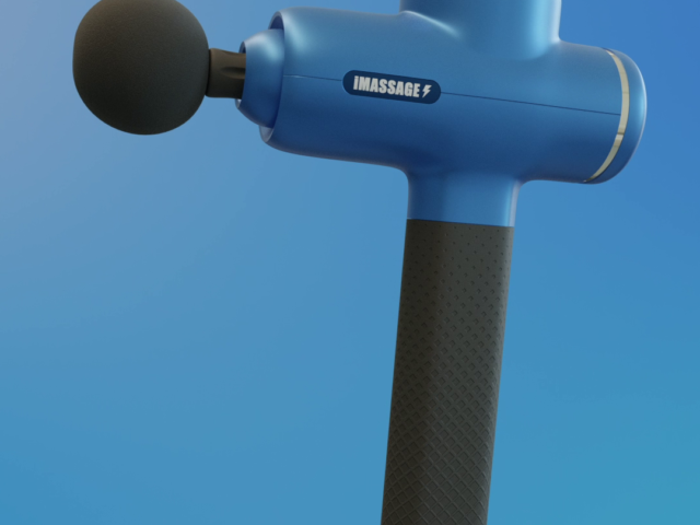 A simple product render I made, featuring a blue massage gun. The checkered texture on the grip was created procedurally. The logo on the side does not belong to a