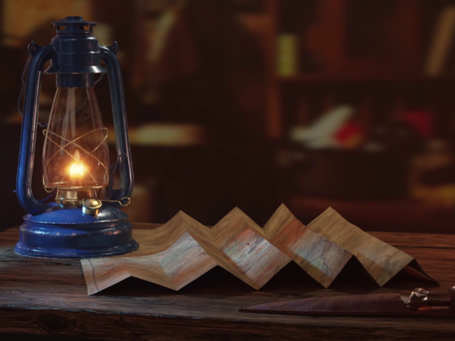 This scene was fully modelled, textured and rendered in Blender. Aside from some downloaded fingerprint and scratch textures, all materials were created procedurally using Blender’s shading nodes. The lantern model